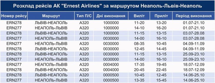 З 18 липня авіакомпанія Ernest Airlines збільшує кількість рейсів з ДП «Міжнародний аеропорт «Львів» ім. Данила Галицького до Неаполя з 3 до 4 разів в тиждень. Польоти з такою частотністю будуть тривати до 12 вересня.
