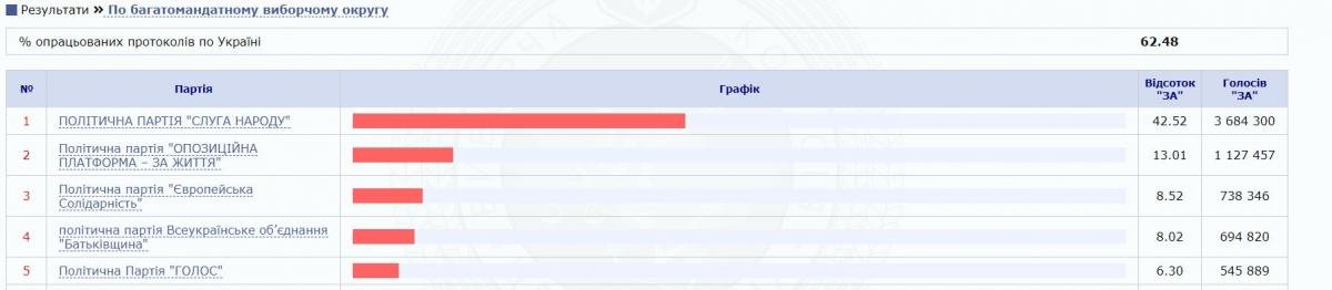 За даними опрацювання 62,48% протоколів, партія «Слуга народу» продовжує лідирувати на парламентських виборах.