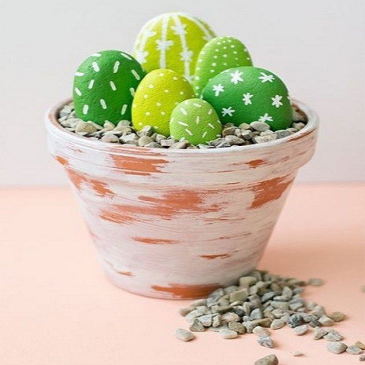 Готові кактуси з каменів посадите в квіткові горщики, наповнені піском, грунтом або дрібним гравієм. Поливати не треба, а от іноді змахувати пил доведеться.