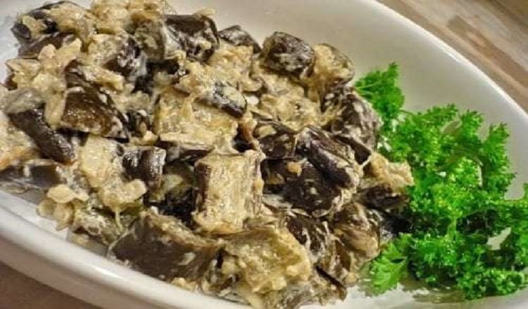 - Додати часник, посолити. Тушкувати ще 5 хвилин. Влити сметану, перемішати, зменшити вогонь, накрити кришкою. Тушковані баклажани в сметані будуть готові через 5 хвилин. Зелену цибулю дрібно нарізати. Баклажани, тушковані в сметані, при подачі посипати зеленою цибулею.