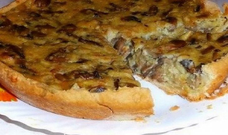 - Тісто розділіть на дві частини і розкачайте кожну в тонкий пласт. Викладіть перший пласт тіста в змащену олією форму. На тісто помістіть грибну начинку, а зверху накрийте другим шаром тіста і защипніть краї.