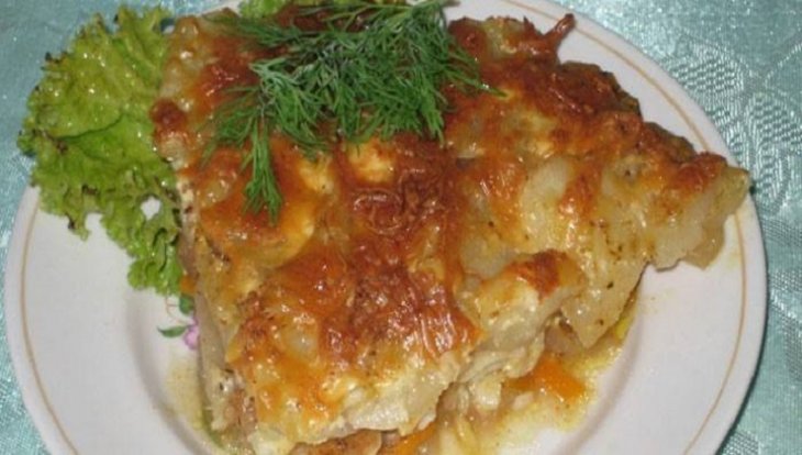 - Четвертий шар – скибочки картоплі. Змастити їх олією, посолити, поперчити і, за бажанням, посипати сушеними травами.