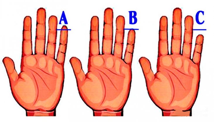 А - Довгий мізинец. Чим довше палець, тим кращі у людини здатності до спілкування. Власники таких мізинців - чарівні, а також дуже харизматичні люди. Ви не звикли здаватися без бою, тому завжди домагаєтеся поставлених цілей. Крім того, ви досить працьовита людина, яка не боїться роботи. Ви можете переконати будь-кого. Ви легко реалізуєте свій талант в сфері продажів.
