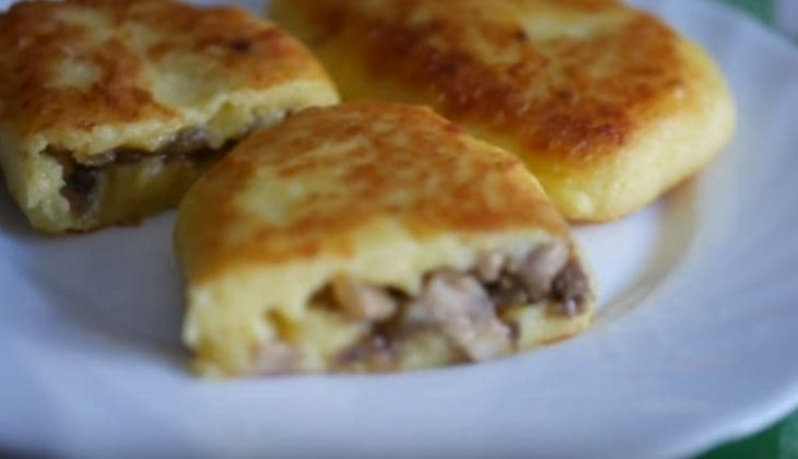 Відварені лісові гриби посмажити на олії з цибулею, посолити. Перемолоти на м'ясорубці чи подрібнити блендером. Формуємо з тіста невеликі кружечки, по центру кладемо начинку, заліплюємо, паніруємо в муці чи в панірувальних сухарях. Смажимо на олії з обох сторін до золотистого кольору.