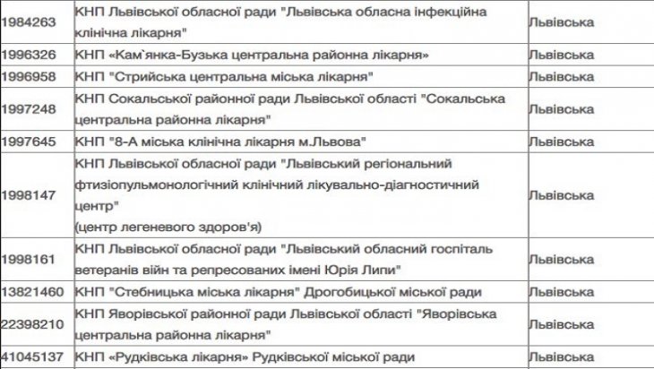 Перелік лікарень першої хвилі для госпіталізації пацієнтів з COVID-19 у Львівській області: