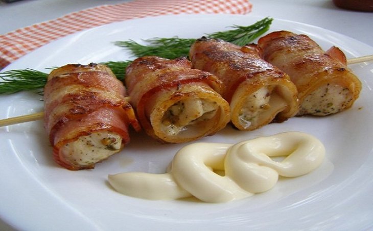 5. Сформувати з фаршу невеликі котлети довгастої форми. Використовувати дерев’яні шпажки, щоб зробити з цих котлет невеликий шашлик. Обгорнути фарш беконом.