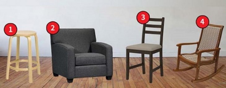 Людина, яка обирає табуретку — добра та щира. Ви вмієте підтримувати та завжди допомагаєте іншим. Заради близьких ви готові на все, навіть жертвувати власними інтересами. Ваш прихований талант — це дарувати людям відчуття затишку та комфорту. Людям поруч з вами неймовірно добре, а ви легко знаходите спільну мову навіть з чужими людьми. Саме тому вам чудово підходить робота де потрібно працювати з клієнтами.Крісло