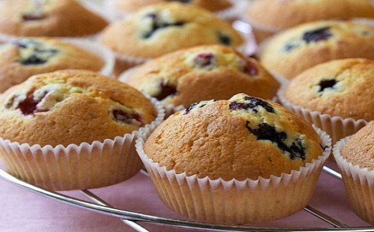 - Форми для кексів змастити вершковим маслом і викласти підготовлені фрукти. Посипати цукром. Зверху викласти тісто.