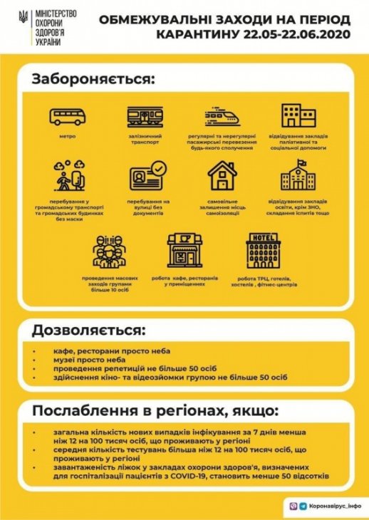Уряд запроваджує в Україні адаптивний карантин до 22 червняВ Україні з 25 травня дозволять відкривати дитячі садочкиНа Львівщині від сьогодні послабили карантин: що дозволено та на що діє заборонаОчільник МОЗ розповів, які пом’якшення карантину чекають на українців 22 травняМОЗ затвердило рекомендації для перукарень, парків та магазинів на час карантину