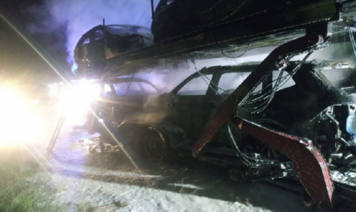На момент прибуття вогнеборців до місця виклику, вогонь повністю охопив автомобілі на лафеті. Вогнеборці не гаючи часу розпочали гасіння пожежі.