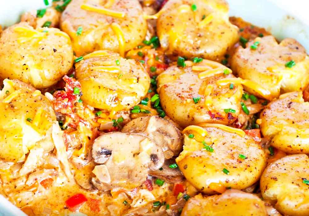 Картоплю нарізати тонкими кружечками. Цибулю — тонкими півкільцями. До цибулі додати 100 г. майонезу і перемішати. У форму для запікання покласти на дно картоплю, зверху половину цибулі, потім куряче м'ясо, на нього другу половину цибулі. Накрити фольгою і випікати 1 годину при 180°.