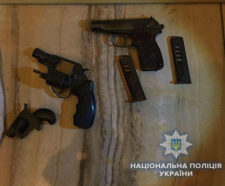 Під час огляду домоволодіння, в якому перебували зловмисники, виявлено та вилучено три одиниці зброї, серед яких бойовий пістолет Макарова, 2 магазини і 9 бойових набоїв до нього, револьвер і пістолет іноземного виробництва калібру 5,6 мм. Усе вилучене буде направлено на експертизу.