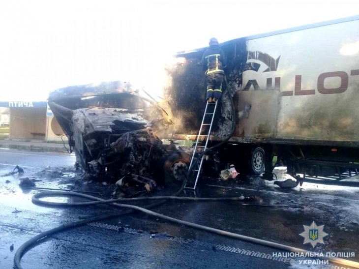 "У результаті зіткнення вантажівка DAF загорілася. У пожежі загинув її водій. Ще один водій, 41-річний житель Житомирської області, не постраждав. Водія молоковоза з термічними опіками 20% тіла госпіталізували в реанімаційне відділення", - йдеться в повідомленні.